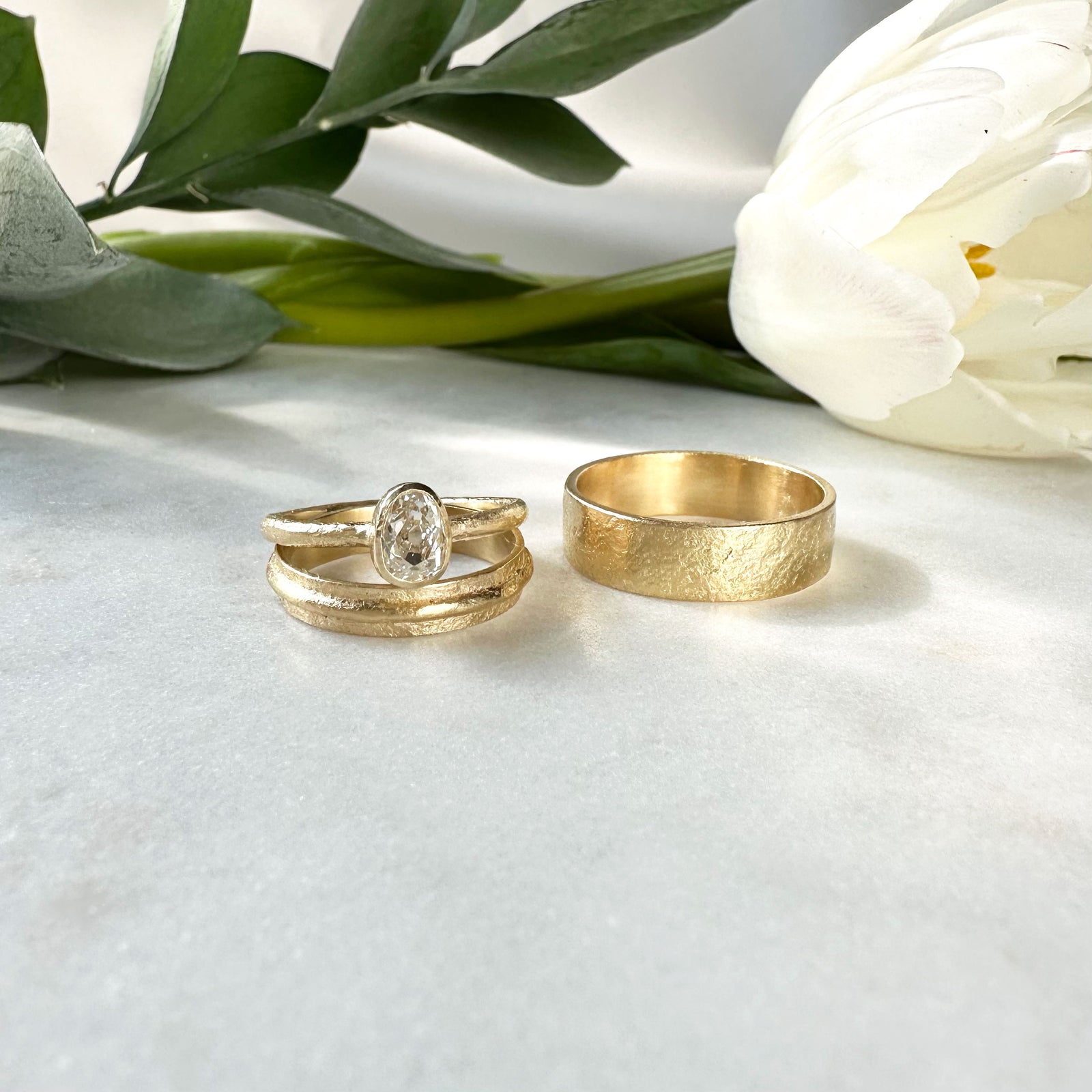 "We received the wedding bands Amanda made for us and they look awesome. They ideally match our vision of us as a couple and our personalities. It was an amazing serendipity to meet Amanda in our town at a show, and we feel very thankful for that."